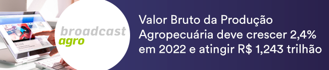 O Valor Bruto da Produção Agropecuária (VBP) de 2022 deverá crescer 2,4% ante 2021 e atingir R$ 1,243 trilhão, segundo o Ministério da Agricultura, destaca o Broadcast Agro. A estimativa com base nas informações de maio é de que o faturamento das lavouras será de R$ 880,37 bilhões (+6,56%). Já a pecuária deve ter VBP de R$ 362,64 bilhões (-6,4%), menor em comparação ao do ano passado.