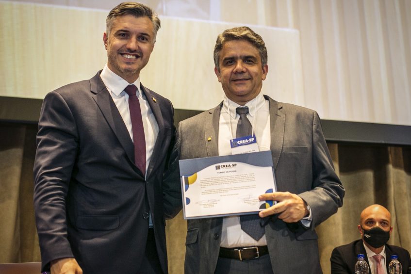 Para iniciar a nomeação dos novos conselheiros, Marchese fez a entrega simbólica do termo de posse de conselheiro titular ao Eng. Carlos Ferreira da Silva Seeger, representante da Associação dos Engenheiros, Arquitetos e Agrônomos do Município de Guarulhos (ASSEAG) no Plenário do Crea-SP.