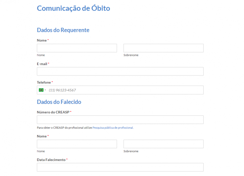 O serviço é bastante simples. Basta que um familiar ou responsável legal acesse o site www.creasp.org.br, clique em Serviços no menu principal e, na aba de Profissionais, clique em ‘Cancelamento de registro/visto profissional por óbito’. Na página carregada, na lateral direita, é só utilizar o ‘Clique aqui’ da seção ‘Como solicitar o serviço?’. Uma nova página com o formulário abaixo será carregada na tela.