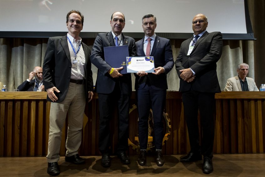 O Prof. Dr. Eng. Quim. Reinaldo Giudici, representante da Escola Politécnica da Universidade de São Paulo (Poli-USP), falou em nome dos homenageados com a Menção Honrosa do Crea-SP, destinada às instituições de ensino que contribuíram para a melhoria dos serviços prestados pelo Sistema Confea/Crea, para o desenvolvimento socioeconômico, tecnológico e sustentável do país e para a qualidade de vida das pessoas. “A Escola Politécnica foi fundada por pioneiros e visionários que viam na Engenharia um caminho para o desenvolvimento do Brasil. Através das atividades de pesquisa, interagimos com a sociedade em busca de soluções para problemas desafiadores”, afirmou.
