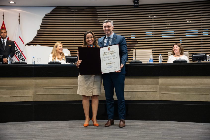 A vereadora Janaína Lima, autora da iniciativa, foi quem presidiu a sessão solene. “O Crea-SP é uma instituição que tem se renovado e dado direcionamentos como um grande farol para as outras”, comentou em relação à Salva de Prata. Já sobre o título concedido ao presidente, a vereadora ressaltou que esta foi uma gestão que deixou claro o seu compromisso com a cidade, lembrando o processo de inovação em curso no Conselho e citando como exemplo os coworkings da rede CreaLab. “São Paulo é como uma família que a gente constrói ao longo de nossa trajetória e é importante reconhecer os filhos que escolheram a cidade e ela escolheu de volta. Seja muito bem-vindo como cidadão paulistano, Vinicius”.