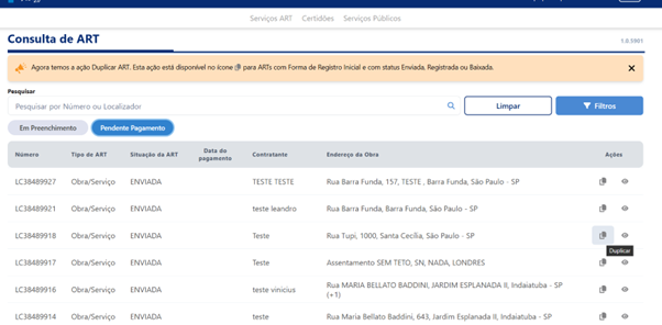 Área de consulta para duplicação de ART