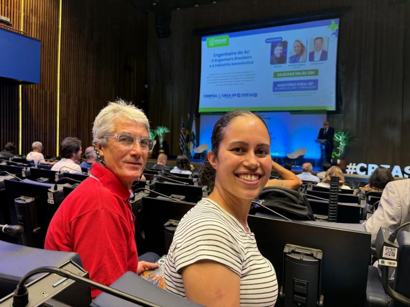 Na plateia, duas histórias que mostram a diversidade dos espectadores. O Eng. Mec. Jefferson Vieitas Fragoso, com 45 anos de trajetória na aviação e experiência como piloto, gestor de manutenção e de segurança de voo (na foto acima). “Estou aqui para fazer networking e entender o apoio e a maior aproximação do Crea-SP com a Engenharia Aeronáutica, algo que acredito ser importante”. Já a Eng. Karina Souza acompanhou as palestras com entusiasmo, ressaltando seu interesse em ampliar conhecimentos, e trouxe um convidado com ela. “É o meu pai, ele também é engenheiro como eu e ambos acompanhamos o Lito. Estou considerando uma especialização em Engenharia Aeroespacial”, admitiu (foto abaixo).