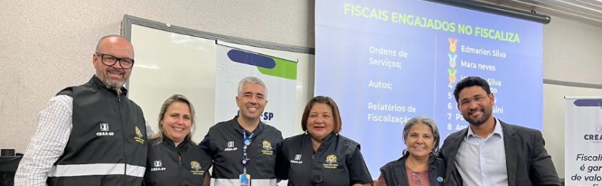 O Eng. Amb. Kleber Brunheira, gerente de Fiscalização do Crea-SP; a superintendente de Fiscalização do Crea-SP, Eng. Maria Edith dos Santos; e o superintendente de Tecnologia e Inovação da autarquia, Marcelo Pessoa (esq. para dir.) e fiscais do Crea-SP