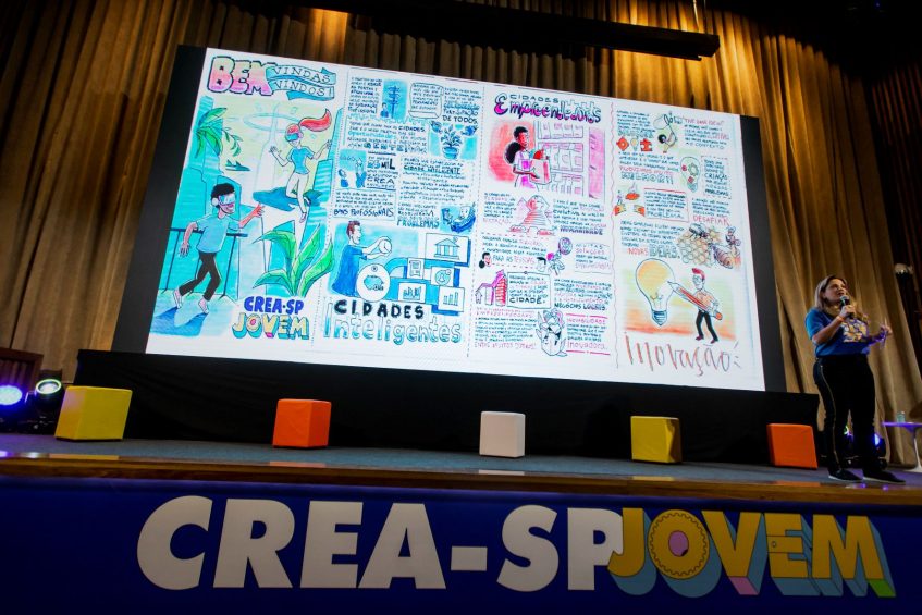 Lambe-lambes em branco convidam os participantes a deixarem suas marcas com mensagens, desenhos e assinaturas. Cartunistas rascunham ideias no papel e traduzem a complexidade do assunto em tirinhas de quadrinho. Câmeras de celular apontam para um QR Code e acessam um jogo com desafios a serem superados a cada fase. Uma cabine 360º movimenta a sala e registra as cenas em fotos e vídeos. Foi neste cenário interativo e dinâmico que o XIII Encontro Crea-SP Jovem aconteceu sábado (29/10), na Sede Angélica do Conselho, onde mais de 400 pessoas puderam assistir a debates sobre inovação, empreendedorismo e cidades inteligentes.