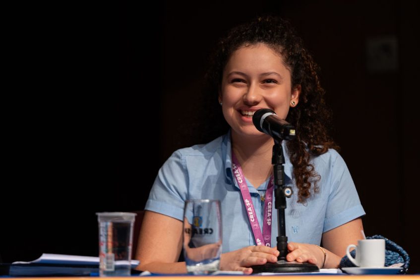 O clima da sessão, que tem seus ritos tão tradicionais entre votação de processos administrativos e manifestações de conselheiros, se tornou leve com os 90 estudantes e recém-formados que estiveram, ao longo da semana, no ‘Por dentro do Crea-SP’, o programa de Estágio Visita do Conselho. Os olhos curiosos e as falas baixas de compartilhamento de dúvidas e observações sobre a condução dos trabalhos pararam completamente por alguns minutos enquanto Verônica Fiorin Arruda, aluna do 7º período do curso de Engenharia Aeronáutica e Espacial da Universidade do Vale do Paraíba (UNIVAP), falava, diante de todos, do sentimento de estar no maior Conselho de fiscalização profissional da América Latina, a quase 3 mil quilômetros de casa.