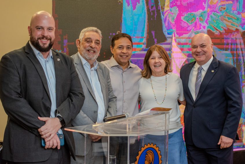 (Miguel Fernández, presidente do Crea-RJ; Jorge Silva, presidente do Crea-ES; Neovanio Lima, presidente do Crea-PR; Lígia Mackey, presidente do Crea-SP; e Marcos Gervásio, presidente do Crea-MG.)