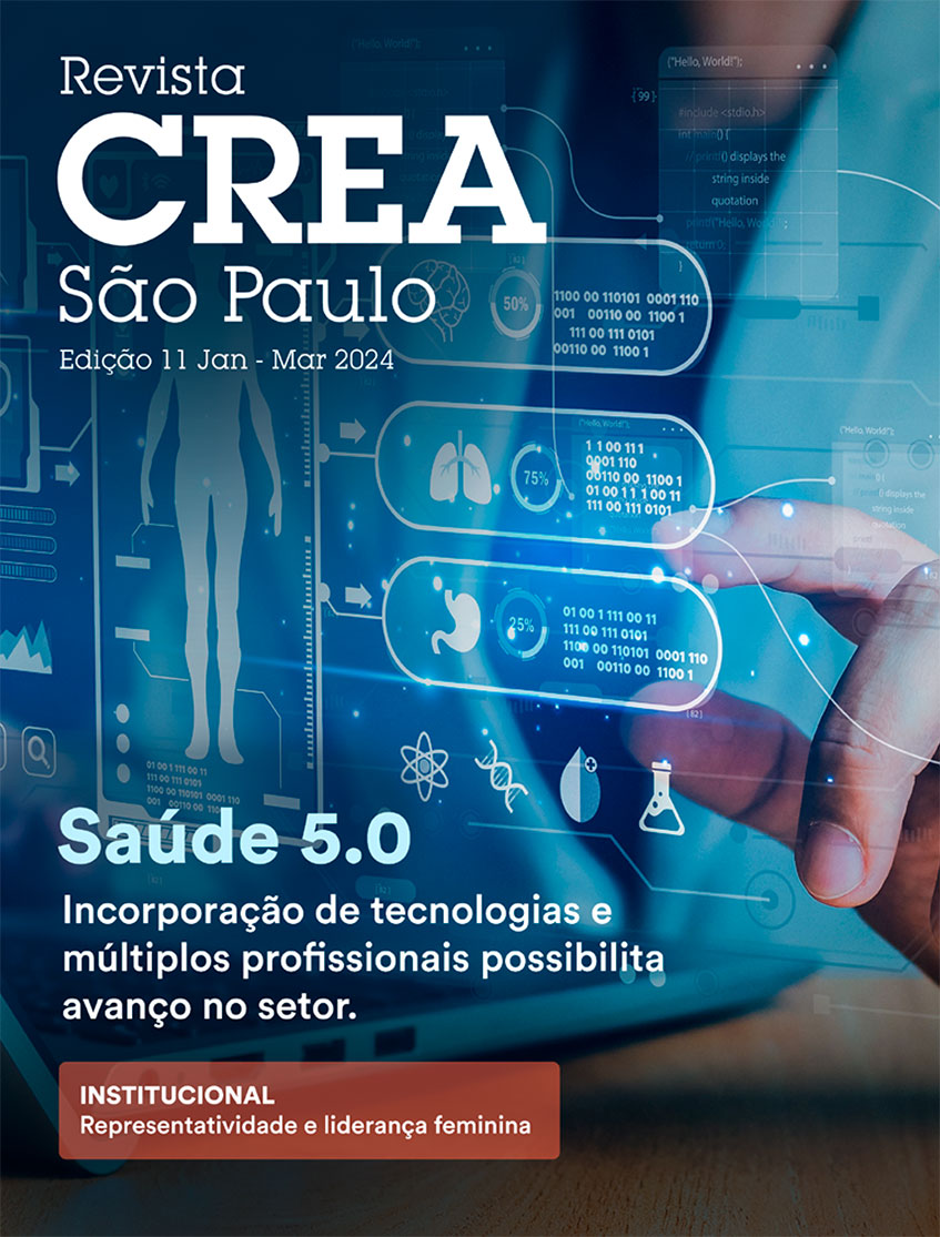 A incorporação de tecnologias e múltiplos profissionais como meio para possibilitar o avanço de diagnósticos e tratamentos no setor de saúde é o tema da capa e da reportagem de páginas centrais da Revista CREA São Paulo, que chega ao seu 11º número celebrando também a representatividade e a liderança feminina.