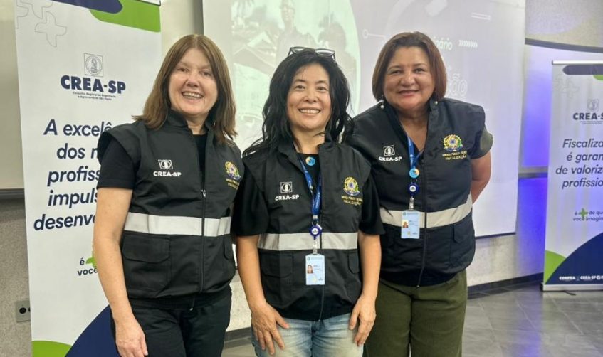 A Eng. Lígia Mackey, presidente do Crea-SP; a fiscal Regina Furuya; e a Eng. Maria Edith dos Santos, superintendente de fiscalização